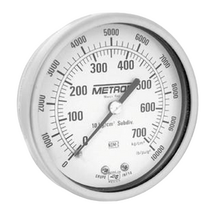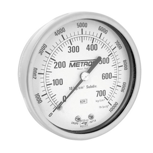 Manómetro Patrón Metrón 15250M 6" Conex inf. acero inox ½"-¼" NPT. Rango 105 y 700 kg/cm²(1500-10000 PSI) Seco