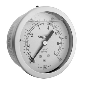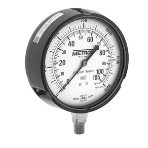 Manómetro Metrón 10160L 4" Conex. posterior de acero inox de ½"-¼" NPT. Rango 105-700 kg/cm²(1500-10000). Líquido.