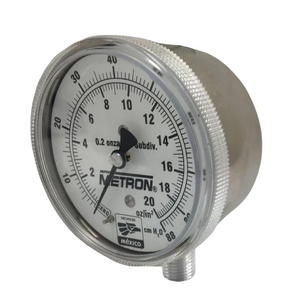Manómetro Metrón 63200SS - 63210SS 2 1/2" Conex inferior o post. de acero inox ¼" NPT. Rango 10-100 oz/pulg². Seco