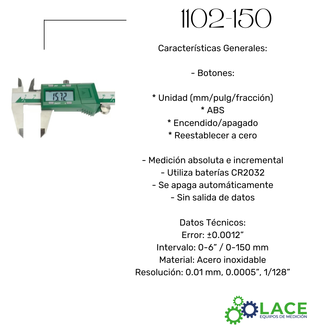 El Calibrador Digital INSIZE 1102-150 está diseñado para mediciones con lectura en milímetros, pulgadas y fracciones. Fabricado en acero inoxidable, ofrece precisión y confiabilidad para aplicaciones de medición dimensional.