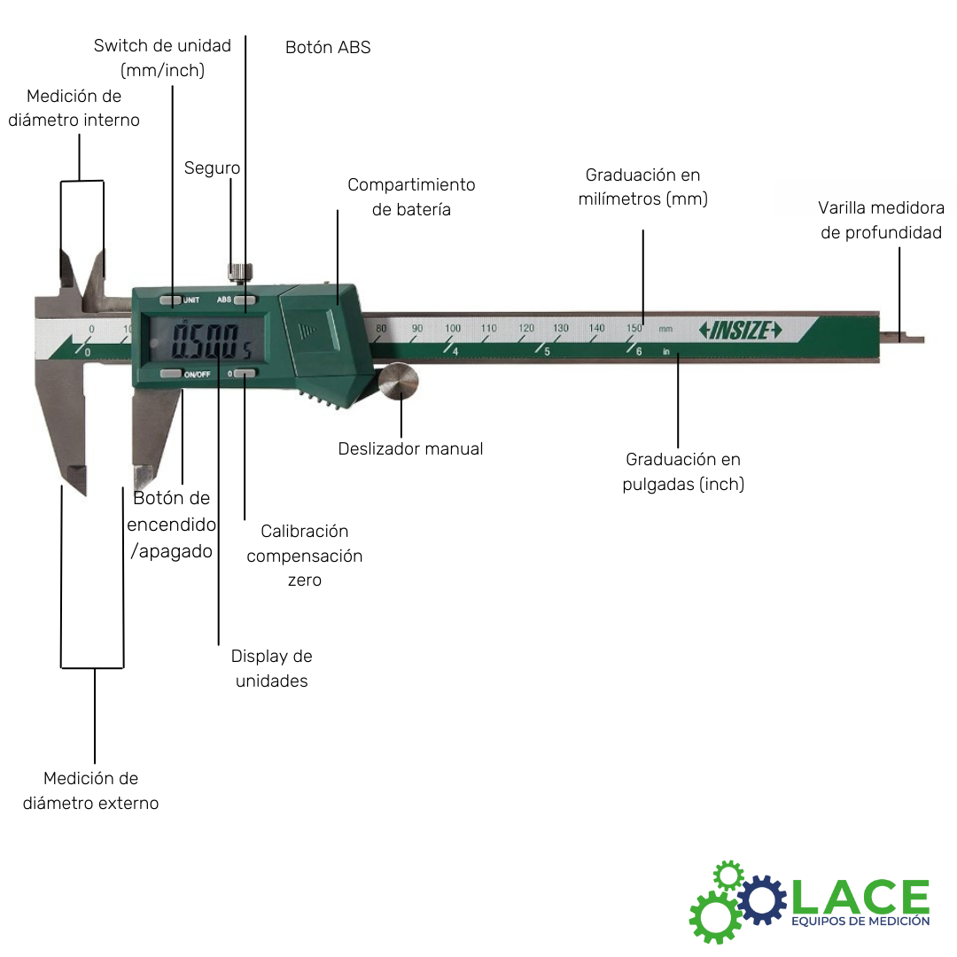 Botones: unidad (mm/in/fracción), on/off, cero